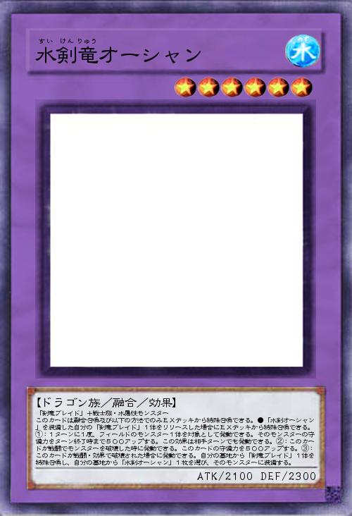 | 「剣竜ブレイド」+戦士族・水属性モンスター このカードは融合召喚及び以下の方法でのみEXデッキから特殊召喚できる。●「水剣オーシャン」を装備した自分の「剣竜ブレイド」1体をリリースした場合にEXデッキから特殊召喚できる。①:1ターンに1度、フィールドのモンスター1体を対象として発動できる。そのモンスターの守備力をターン終了時まで500アップする。この効果は相手ターンでも発動できる。②:このカードが戦闘でモンスターを破壊した時に発動できる。このカードの守備力を500アップする。③:このカードが戦闘・効果で破壊された場合に発動できる。自分の墓地から「剣竜ブレイド」1体を特殊召喚し、自分の墓地から「水剣オーシャン」1枚を選び、そのモンスターに装備する。 | |||