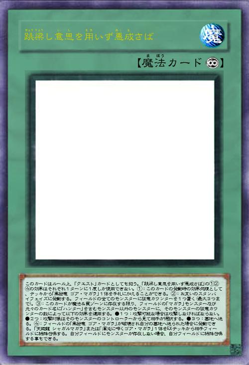 | このカードはルール上、「クエスト」カードとしても扱う。「跳梁し意思を用いず悪成さば」の①②④の効果はそれぞれ1ターンに1度しか使用できない。①:このカードの発動時の効果処理として、デッキから「黒蝕竜 ゴア・マガラ」1体を手札に加えることができる。②:お互いのスタンバイフェイズに発動する。フィールドの全てのモンスターに狂竜カウンターを1つ置く(最大3つまで)。③:このカードが魔法&罠ゾーンに存在する限り、フィールドの「マガラ」モンスター及び元々のカード名に「ハンター」を含むモンスター以外のモンスターに、そのモンスターの狂竜カウンターの数によって以下の効果を適用する。●1つ:攻撃可能な場合は攻撃しなければならない。●2つ:攻撃対象はそのモンスターのコントローラーから見て相手が選択する。●3つ:墓地へ送る。④:フィールドの「黒蝕竜 ゴア・マガラ」が破壊され自分の墓地へ送られた場合に発動できる。「 | |||