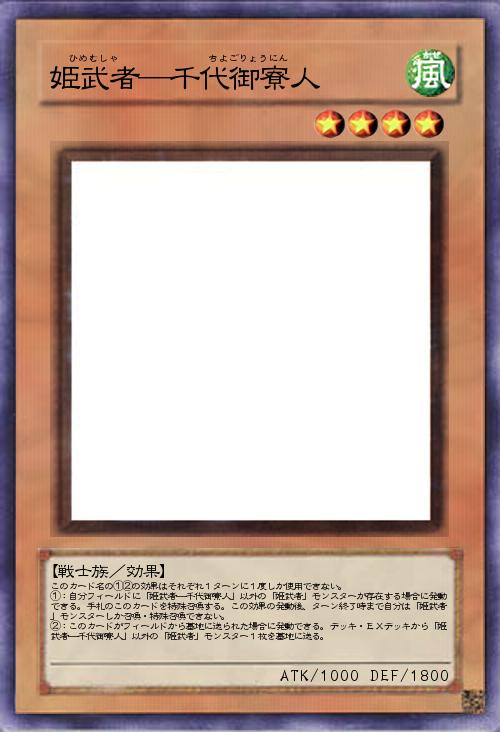 | このカード名の①②の効果はそれぞれ1ターンに1度しか使用できない。 ①:自分フィールドに「姫武者─千代御寮人」以外の「姫武者」モンスターが存在する場合に発動できる。手札のこのカードを特殊召喚する。この効果の発動後、ターン終了時まで自分は「姫武者」モンスターしか召喚・特殊召喚できない。 ②:このカードがフィールドから墓地に送られた場合に発動できる。デッキ・EXデッキから「姫武者─千代御寮人」以外の「姫武者」モンスター1枚を墓地に送る。 | |||