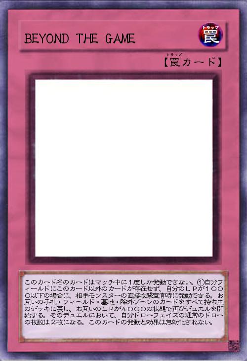 | このカード名のカードはマッチ中に1度しか発動できない。①自分フィールドにこのカード以外のカードが存在せず、自分のLPが1000以下の場合に、相手モンスターの直接攻撃宣言時に発動できる。お互いの手札・フィールド・墓地・除外ゾーンのカードをすべて持ち主のデッキに戻し、お互いのLPが4000の状態で再びデュエルを開始する。そのデュエルにおいて、自分ドローフェイズの通常のドローの枚数は2枚になる。このカードの発動と効果は無効化されない。 | |||
