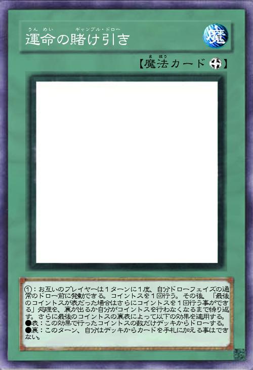 | ①:お互いのプレイヤーは1ターンに1度、自分ドローフェイズの通常のドロー前に発動できる。コイントスを1回行う。その後、「最後のコイントスが表だった場合はさらにコイントスを1回行う事ができる」処理を、裏が出るか自分がコイントスを行わなくなるまで繰り返す。さらに最後のコイントスの裏表によって以下の効果を適用する。 ●表:この効果で行ったコイントスの数だけデッキからドローする。 ●裏:このターン、自分はデッキからカードを手札に加える事はできない。 | |||