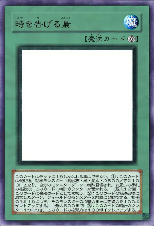 | このカードはデッキに1枚しか入れる事はできない。①:このカードは発動後、効果モンスター(鳥獣族・風・星4・攻500/守2100)となり、自分のモンスターゾーンに特殊召喚され、お互いの手札の枚数分、このカードに時計カウンターが置かれる。(最大12個)このカードは魔法カードとしても扱う。②:このカードの特殊召喚に成功したターン、フィールドのモンスターを対象に発動できる。相手の手札1枚につき、そのモンスターの攻撃力または守備力を100ポイントアップする。(最大600まで)③:このカードの時計カウンター1つにつき、このカードの攻撃力は100ポイントアップする。 | |||