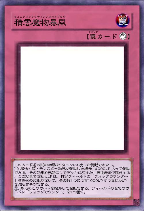 | このカード名の②の効果は1ターンに1度しか発動できない。 ①:魔法・罠・モンスター効果が発動した場合、4000LP払って発動できる。その効果を無効にしてデッキに戻すか、裏側表示で除外する。この効果で支払うLPは、自分フィールドの「フォッグカウンター」を任意の数取り除いて、その数1つにつき1000LPずつ支払うLPを減らす事ができる。 ②:墓地のこのカードを除外して発動できる。フィールドの全てのカードに「フォッグカウンター」を1つ置く。 | |||