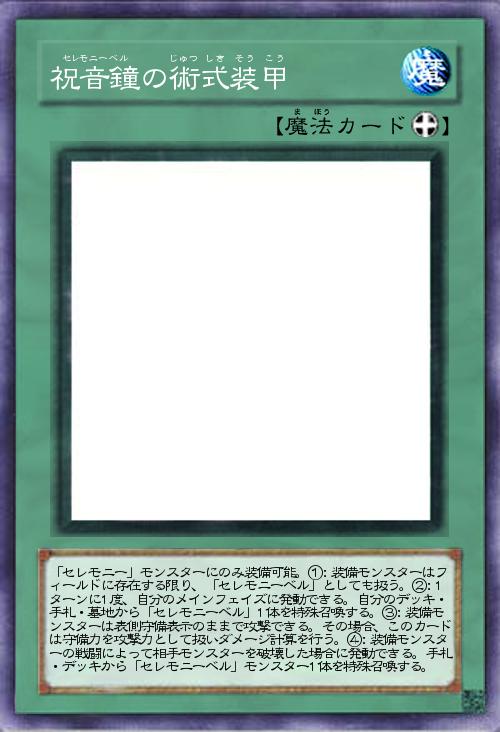| 「セレモニー」モンスターにのみ装備可能。①:装備モンスターはフィールドに存在する限り、「セレモニーベル」としても扱う。②:1ターンに1度、自分のメインフェイズに発動できる。自分のデッキ・手札・墓地から「セレモニーベル」1体を特殊召喚する。③:装備モンスターは表側守備表示のままで攻撃できる。その場合、このカードは守備力を攻撃力として扱いダメージ計算を行う。④:装備モンスターの戦闘によって相手モンスターを破壊した場合に発動できる。手札・デッキから「セレモニーベル」モンスター1体を特殊召喚する。 | |||