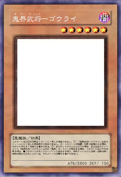 | このカード名の②の効果は1ターンに1度しか使用できない。①:「鬼界武将ーゴウライ」は自分フィールドに1体しか表側表示で存在できない。②:このカードが戦闘・効果で破壊される場合、代わりに手札を1枚捨てる事ができる。③:自分のLPが3000以下の場合、または自分フィールドに「鬼界武将ーゴウライ」以外の「鬼界」モンスターが存在する場合、このカードは以下の効果を得る。●このカードがモンスターゾーンに存在する限り、相手フィールドに召喚・反転召喚・特殊召喚されたモンスターは、そのターンに攻撃する事ができない。 | |||