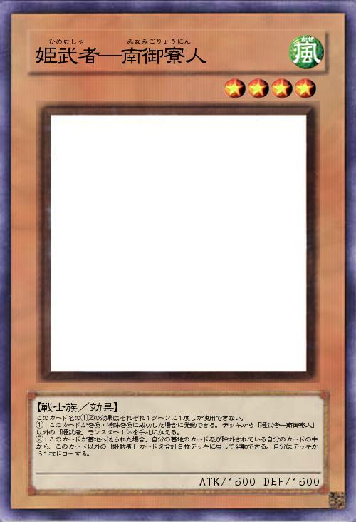 | このカード名の①②の効果はそれぞれ1ターンに1度しか使用できない。 ①:このカードが召喚・特殊召喚に成功した場合に発動できる。デッキから「姫武者─南御寮人」以外の「姫武者」モンスター1体を手札に加える。 ②:このカードが墓地へ送られた場合、自分の墓地のカード及び除外されている自分のカードの中から、このカード以外の「姫武者」カードを合計3枚デッキに戻して発動できる。自分はデッキから1枚ドローする。 | |||