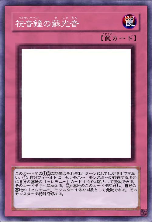 | このカード名の①②の効果はそれぞれ1ターンに1度しか使用できない。①:自分フィールドに「セレモニー」モンスターが存在する場合に自分の墓地の「セレモニー」カード1枚を対象として発動できる。そのカードを手札に加える。②:墓地のこのカードを除外し、自分の墓地の「セレモニー」モンスター1体を対象として発動できる。そのモンスターを特殊召喚する。 | |||