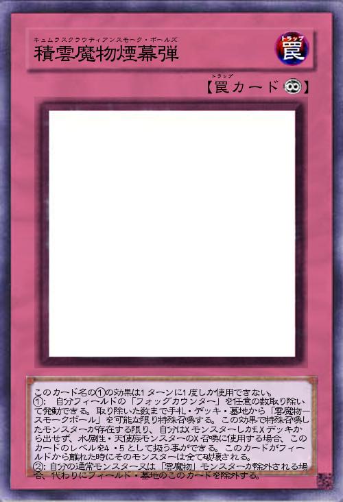 | このカード名の①の効果は1ターンに1度しか使用できない。 ①: 自分フィールドの「フォッグカウンター」を任意の数取り除いて発動できる。取り除いた数まで手札・デッキ・墓地から「雲魔物-スモークボール」を可能な限り特殊召喚する。この効果で特殊召喚したモンスターが存在する限り、自分はXモンスターしかEXデッキから出せず、水属性・天使族モンスターのX召喚に使用する場合、このカードのレベルを4・5として扱う事ができる。このカードがフィールドから離れた時にそのモンスターは全て破壊される。 ②:自分の通常モンスター又は「雲魔物」モンスターが除外される場合、代わりにフィールド・墓地のこのカードを除外する。 | |||