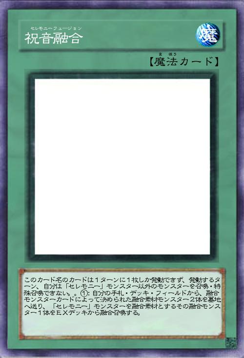 | このカード名のカードは1ターンに1枚しか発動できず、発動するターン、自分は「セレモニー」モンスター以外のモンスターを召喚・特殊召喚できない。。①:自分の手札・デッキ・フィールドから、融合モンスターカードによって決められた融合素材モンスター2体を墓地へ送り、「セレモニー」モンスターを融合素材とするその融合モンスター1体をEXデッキから融合召喚する。 | |||