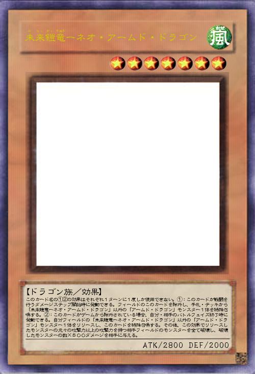 | このカード名の①②の効果はそれぞれ1ターンに1度しか使用できない。①:このカードが戦闘を行うダメージステップ開始時に発動できる。フィールドのこのカードを除外し、手札・デッキから「未来鎧竜ーネオ・アームド・ドラゴン」以外の「アームド・ドラゴン」モンスター1体を特殊召喚する。②:このカードがゲームから除外されている場合、自分・相手のバトルフェイズ終了時に発動できる。自分フィールドの「未来鎧竜ーネオ・アームド・ドラゴン」以外の「アームド・ドラゴン」モンスター1体をリリースし、このカードを特殊召喚する。その後、この効果でリリースしたモンスターの元々の攻撃力以上の攻撃力を持つ相手フィールドのモンスターを全て破壊し、破壊したモンスターの数×500ダメージを相手に与える。 | |||