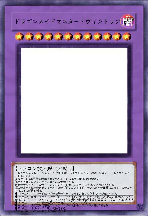 | 「ドラゴンメイド」モンスター×3もしくは「ドラゴンメイド」融合モンスター+「ドラゴンメイド」モンスター このカード名の①の効果はそれぞれ1ターンに1度しか使用できない。 ①自分・相手のスタンバイフェイズに発動できる。 自分のデッキ・手札から「ドラゴンメイド」モンスター1体を選んで特殊召喚する。 ②このカード以外の自分フィールド上の「ドラゴンメイド」モンスターの種類によって、このカードは以下の効果を得る。 ●1つ以上:このカードは相手の効果の対象にならず、相手の効果では破壊されない。 ●2つ以上:自分フィールド上の「ドラゴンメイド」モンスター1体を手札に戻し、自分の手札・墓地から「ドラゴンメイド」モンスター1体を選んで特殊召喚する。 ●3つ以上:このカードの攻撃力・守備力は1000アップする。 ●4つ以上:①の効果で墓地の「ドラゴンメイド」モンスターも対象にできる ●5つ以上:1ターンに1度 | |||
