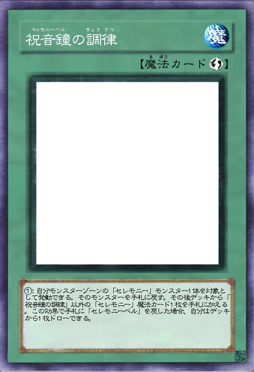 | ①:自分モンスターゾーンの「セレモニー」モンスター1体を対象として発動できる。そのモンスターを手札に戻す。その後デッキから「祝音鐘の調律」以外の「セレモニー」魔法カード1枚を手札に加える。この効果で手札に「セレモニーベル」を戻した場合、自分はデッキから1枚ドローできる。 | |||