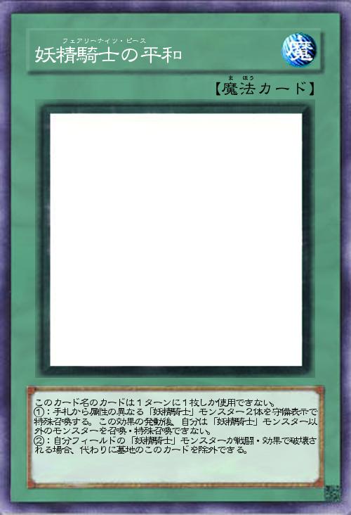 | このカード名のカードは1ターンに1枚しか使用できない。 ①:手札から属性の異なる「妖精騎士」モンスター2体を守備表示で特殊召喚する。この効果の発動後、自分は「妖精騎士」モンスター以外のモンスターを召喚・特殊召喚できない。 ②:自分フィールドの「妖精騎士」モンスターが戦闘・効果で破壊される場合、代わりに墓地のこのカードを除外できる。 | |||