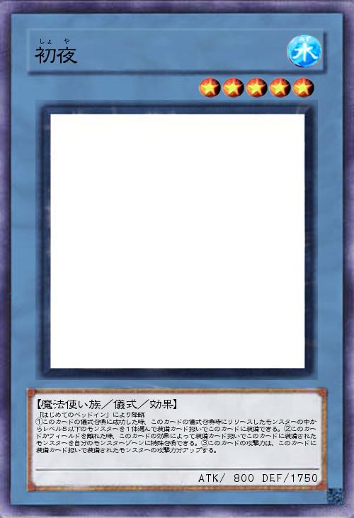| 「はじめてのベッドイン」により降臨 ①このカードの儀式召喚に成功した時、このカードの儀式召喚時にリリースしたモンスターの中からレベル5以下のモンスターを1体選んで装備カード扱いでこのカードに装備できる。②このカードがフィールドを離れた時、このカードの効果によって装備カード扱いでこのカードに装備されたモンスターを自分のモンスターゾーンに特殊召喚できる。③このカードの攻撃力は、このカードに装備カード扱いで装備されたモンスターの攻撃力分アップする。 | |||