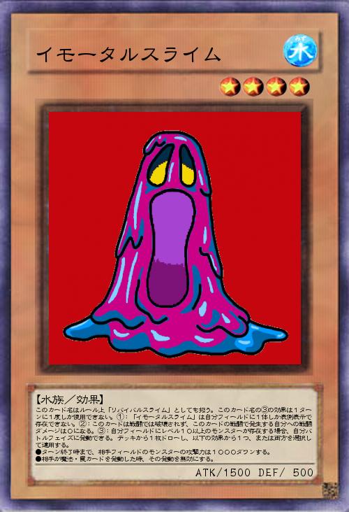 | このカード名はルール上「リバイバルスライム」としても扱う。このカード名の③の効果は1ターンに1度しか使用できない。①:「イモータルスライム」は自分フィールドに1体しか表側表示で存在できない。②:このカードは戦闘では破壊されず、このカードの戦闘で発生する自分への戦闘ダメージは0になる。③:自分フィールドにレベル10以上のモンスターが存在する場合、自分バトルフェイズに発動できる。デッキから1枚ドローし、以下の効果から1つ、または両方を選択して適用する。 ●ターン終了時まで、相手フィールドのモンスターの攻撃力は1000ダウンする。 ●相手が魔法・罠カードを発動した時、その発動を無効にする。 | |||