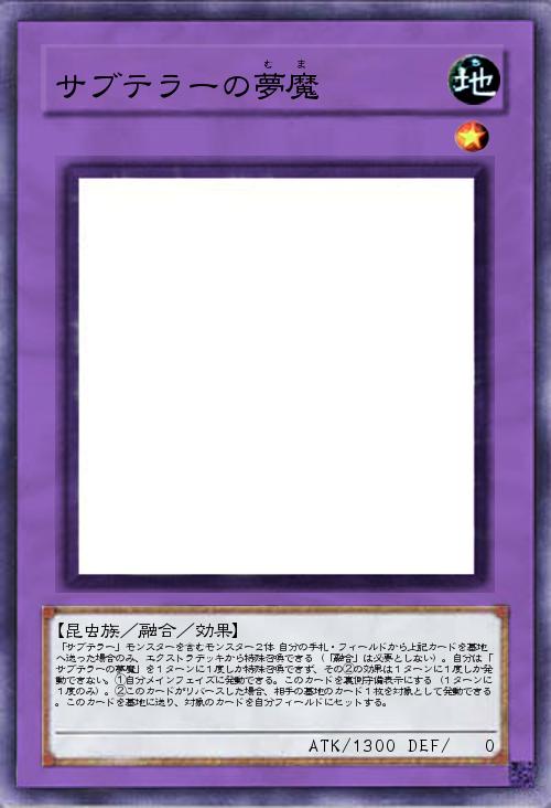 | 「サブテラー」モンスターを含むモンスター2体 自分の手札・フィールドから上記カードを墓地へ送った場合のみ、エクストラデッキから特殊召喚できる(「融合」は必要としない)。自分は「サブテラーの夢魔」を1ターンに1度しか特殊召喚できず、その②の効果は1ターンに1度しか発動できない。①自分メインフェイズに発動できる。このカードを裏側守備表示にする(1ターンに1度のみ)。②このカードがリバースした場合、相手の墓地のカード1枚を対象として発動できる。このカードを墓地に送り、対象のカードを自分フィールドにセットする。 | |||