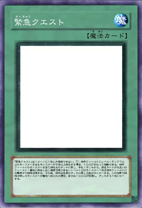 | 「緊急クエスト」は1ターンに1枚しか使用できない。①:相手フィールドにレベル・ランク7以上のモンスターを含むモンスターが3体以上存在する場合、100LPを払って発動できる。相手フィールドのモンスターを全て持ち主のデッキに戻し、手札・デッキから、同名カードがお互いのフィールド・墓地に存在しない通常召喚できないレベル10のモンスター1体を相手フィールドに攻撃表示で特殊召喚する。その後、相手は自身のデッキに戻した数だけドローする。この効果で特殊召喚したモンスターが墓地へ送られた場合、自分は1000LP回復し、デッキから1枚ドローする。 | |||