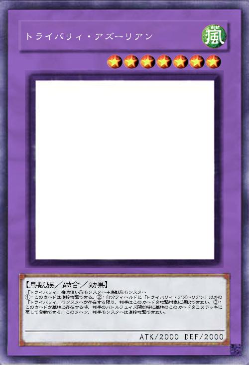 | 「トライバリィ」魔法使い族モンスター+鳥獣族モンスター ①:このカードは直接攻撃できる。②:自分フィールドに「トライバリィ・アズーリアン」以外の「トライバリィ」モンスターが存在する限り、相手はこのカードを攻撃対象に選択できない。③:このカードが墓地に存在する時、相手のバトルフェイズ開始時に墓地のこのカードをEXデッキに戻して発動できる。このターン、相手モンスターは直接攻撃できない。 | |||