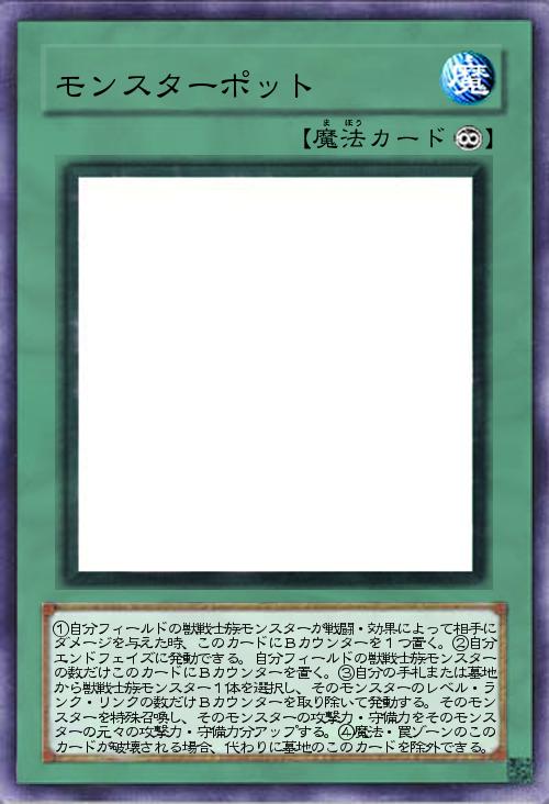 「魔法・罠ゾーンのこのカードが破壊」の文章の前に「自分の墓地にモンスターポットが存在する時」という文言は入れるべきでしょうがテキストが枠に収まらなくなってしまうので端折っています。」(2022-01-15 19:00)