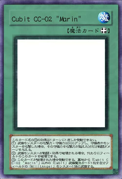 | このカード名の③の効果は1ターンに1度しか発動できない。 ①:装備モンスターの攻撃力・守備力は300アップし、守備表示モンスターを攻撃した場合、その守備力を攻撃力が超えた分だけ戦闘ダメージを与える。 ②:装備モンスターが戦闘・効果で破壊される場合、代わりにフィールドのこのカードを破壊できる。 ③:このカードが破壊された場合発動できる。墓地から「Cubit CC-02 "Marin"」以外の「Cubit」装備魔法カード1枚を自分フィールドの「MilitAngel」モンスター1体に装備する。 | |||
