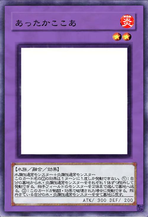 | 水属性通常モンスター+炎属性通常モンスター このカード名の②の効果は1ターンに1度しか発動できない。①:自分の墓地から水・炎属性通常モンスターをそれぞれ1体ずつ除外して発動できる。相手フィールドのモンスターを2体まで選んで墓地へ送る。②:このカードが戦闘・効果で破壊された場合に発動できる。除外さている自分の水・炎属性通常モンスターを全て墓地に戻す。 | |||