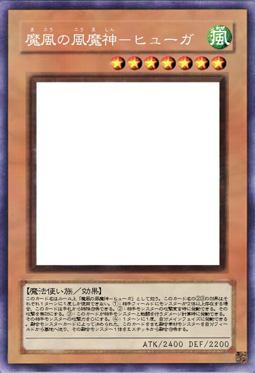 | このカード名はルール上「魔風の風魔神-ヒューガ」として扱う。このカード名の②③の効果はそれぞれ1ターンに1度しか使用できない。①:相手フィールドにモンスターが2体以上存在する場合、このカードは手札から特殊召喚できる。②:相手モンスターの攻撃宣言時に発動できる。その攻撃を無効にする。③:このカードが相手モンスターと戦闘を行うダメージ計算時に発動できる。その相手モンスターの攻撃力を0にする。④:1ターンに1度、自分メインフェイズに発動できる。融合モンスターカードによって決められた、このカードを含む融合素材モンスターを自分フィールドから墓地へ送り、その融合モンスター1体をEXデッキから融合召喚する。 | |||