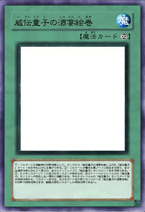 | ①:このカードの発動時の効果処理として、デッキから「威伝童子の酒宴絵巻」以外の「威伝童子」カード1枚を手札に加える事ができる。②:このカードが魔法&罠ゾーンに存在する限り、自分は通常召喚に加えて1度だけ、自分メインフェイズに「威伝童子」モンスター1体を召喚できる。③:EXモンスターゾーンに自分のモンスターが存在せず、自分フィールドにレベル4の「威伝童子」モンスターが存在しない場合に発動できる。手札からレベル4の「威伝童子」モンスター1体を特殊召喚する。このターン自分は、元々のカード名が同じモンスターを「威伝童子の酒宴絵巻」の効果で特殊召喚できず、獣戦士族モンスターしか特殊召喚できない。 | |||