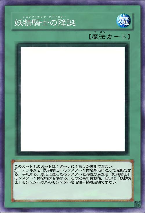 | このカード名のカードは1ターンに1枚しか使用できない。 ①:デッキから「妖精騎士」モンスター1体を墓地に送って発動できる。手札から、墓地に送ったモンスターと属性の異なる「妖精騎士」モンスター1体を特殊召喚する。この効果の発動後、自分は「妖精騎士」モンスター以外のモンスターを召喚・特殊召喚できない。 | |||