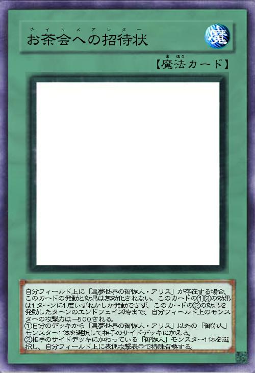 | 自分フィールド上に「悪夢世界の御伽人・アリス」が存在する場合、このカードの発動と効果は無効化されない。このカードの①②の効果は1ターンに1度いずれかしか発動できず、このカードの②の効果を発動したターンのエンドフェイズ時まで、自分フィールド上のモンスターの攻撃力は-500される。 ①自分のデッキから「悪夢世界の御伽人・アリス」以外の「御伽人」モンスター1体を選択して相手のサイドデッキに加える。 ②相手のサイドデッキに加わっている「御伽人」モンスター1体を選択し、自分フィールド上に表側攻撃表示で特殊召喚する。 | |||