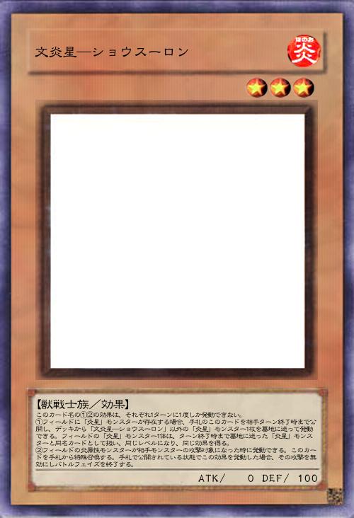 | このカード名の①②の効果は、それぞれ1ターンに1度しか発動できない。 ①フィールドに「炎星」モンスターが存在する場合、手札のこのカードを相手ターン終了時まで公開し、デッキから「文炎星─ショウスーロン」以外の「炎星」モンスター1枚を墓地に送って発動できる。フィールドの「炎星」モンスター1体は、ターン終了時まで墓地に送った「炎星」モンスターと同名カードとして扱い、同じレベルになり、同じ効果を得る。 ②フィールドの炎属性モンスターが相手モンスターの攻撃対象になった時に発動できる。このカードを手札から特殊召喚する。手札で公開されている状態でこの効果を発動した場合、その攻撃を無効にしバトルフェイズを終了する。 | |||