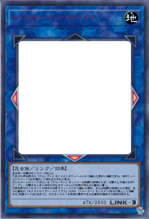 | 昆虫族・地属性モンスター2体以上 ①自分の表側表示の「クローラー」モンスターがフィールドから離れた場合に発動できる。相手フィールドのカード1枚を選択して持ち主の手札に戻す。 ②このカードのリンク先にいる「クローラー」モンスターは戦闘で破壊されず、攻撃力と守備力を300アップし、攻撃するときに相手の手札をランダムに1枚選び持ち主の墓地に置く。 ③表側表示のこのカードが相手の効果でフィールドから離れた場合、または戦闘で破壊された場合、自分の墓地の「エクスクローラー・エクリプス」以外の「クローラー」モンスター2体を対象として発動する[同盟カードは1枚まで]。そのモンスターを表側攻撃表示または裏側守備表示で特殊召喚する。 | |||