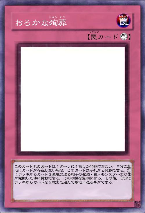 | このカード名のカードは1ターンに1枚しか発動できない。自分の墓地にカードが存在しない場合、このカードは手札から発動できる。①:デッキからカードを墓地に送る相手の魔法・罠・モンスターの効果が発動した時に発動できる。その効果を無効にする。その後、自分はデッキからカードを2枚まで選んで墓地に送る事ができる。 | |||