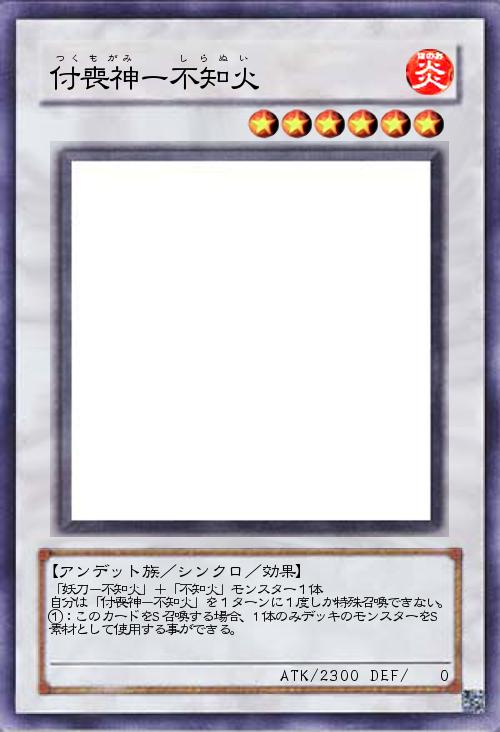 | 「妖刀-不知火」+「不知火」モンスター1体 自分は「付喪神-不知火」を1ターンに1度しか特殊召喚できない。 ①:このカードをS召喚する場合、1体のみデッキのモンスターをS素材として使用する事ができる。 | |||