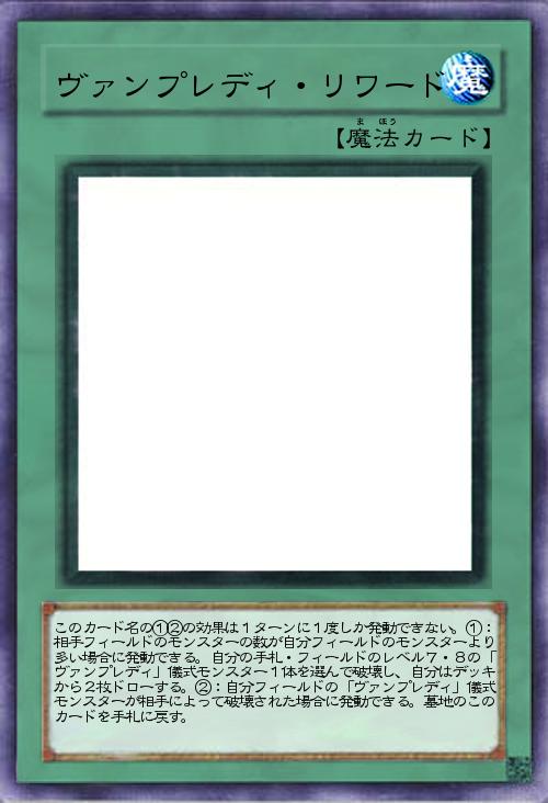| このカード名の①②の効果は1ターンに1度しか発動できない。①:相手フィールドのモンスターの数が自分フィールドのモンスターより多い場合に発動できる。自分の手札・フィールドのレベル7・8の「ヴァンプレディ」儀式モンスター1体を選んで破壊し、自分はデッキから2枚ドローする。②:自分フィールドの「ヴァンプレディ」儀式モンスターが相手によって破壊された場合に発動できる。墓地のこのカードを手札に戻す。 | |||