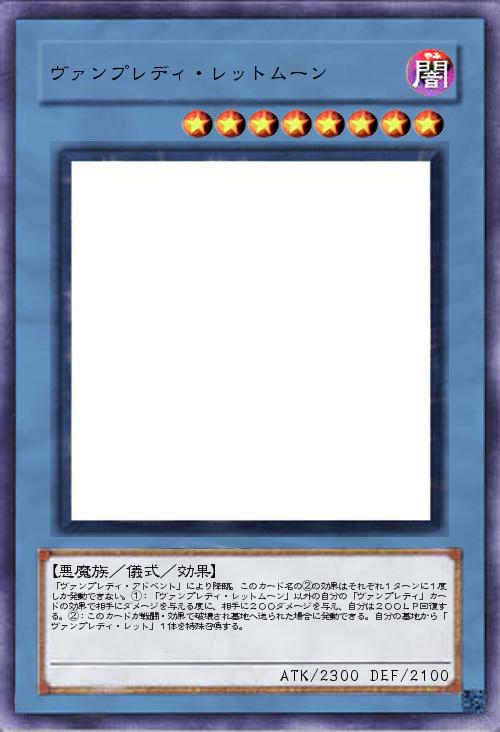 | 「ヴァンプレディ・アドベント」により降臨。このカード名の②の効果はそれぞれ1ターンに1度しか発動できない。①:「ヴァンプレディ・レットムーン」以外の自分の「ヴァンプレディ」カードの効果で相手にダメージを与える度に、相手に200ダメージを与え、自分は200LP回復する。②:このカードが戦闘・効果で破壊され墓地へ送られた場合に発動できる。自分の墓地から「ヴァンプレディ・レット」1体を特殊召喚する。 | |||