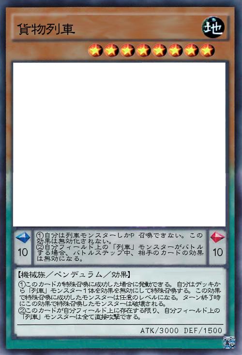 | ①このカードが特殊召喚に成功した場合に発動できる。自分はデッキから「列車」モンスター1体を効果を無効にして特殊召喚する。この効果で特殊召喚に成功したモンスターは任意のレベルになる。ターン終了時にこの効果で特殊召喚したモンスターは破壊される。 ②このカードが自分フィールド上に存在する限り、自分フィールド上の「列車」モンスターは全て直接攻撃できる。 | |||