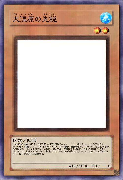 | 「大湿原の先鋭」は1ターンに1度しか特殊召喚できない。 (1):自分フィールドのモンスターが、水族・水属性・レベル2以下のモンスターのみの場合に発動できる。このカードを手札から特殊召喚する。 (2):自分フィールドに「湿地草原」が存在する場合に、手札の水族モンスター1体を捨てて、相手フィールドの水属性モンスター以外の効果モンスター1体を対象として発動できる。そのモンスターを破壊する。 | |||