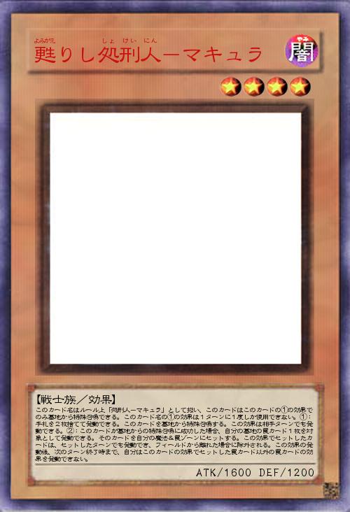 | このカード名はルール上「処刑人-マキュラ」として扱い、このカードはこのカードの①の効果でのみ墓地から特殊召喚できる。このカード名の①の効果は1ターンに1度しか使用できない。①:手札を2枚捨てて発動できる。このカードを墓地から特殊召喚する。この効果は相手ターンでも発動できる。②:このカードが墓地からの特殊召喚に成功した場合、自分の墓地の罠カード1枚を対象として発動できる。そのカードを自分の魔法&罠ゾーンにセットする。この効果でセットしたカードは、セットしたターンでも発動でき、フィールドから離れた場合に除外される。この効果の発動後、次のターン終了時まで、自分はこのカードの効果でセットした罠カード以外の罠カードの効果を発動できない。 | |||