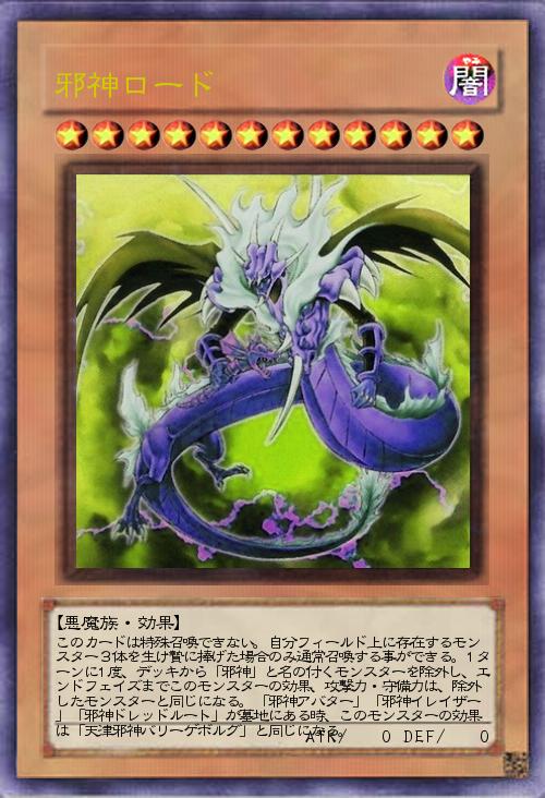 | このカードは特殊召喚できない。自分フィールド上に存在するモンスター3体を生け贄に捧げた場合のみ通常召喚する事ができる。1ターンに1度、デッキから「邪神」と名の付くモンスターを除外し、エンドフェイズまでこのモンスターの効果、攻撃力・守備力は、除外したモンスターと同じになる。「邪神アバター」「邪神イレイザー」「邪神ドレッドルート」が墓地にある時、このモンスターの効果は「天津邪神バリーゲボルグ」と同じになる。 | |||