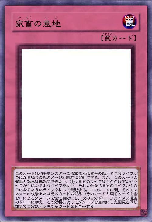 | このカードは相手モンスターの攻撃または相手の効果で自分ライフが0になる場合のみダメージ計算前に発動できる。また、このカードの発動と効果は無効にできない。①:自分のライフは100以下ならライフが1になるようライフを払い、それ以外なら自分のライフが100になるようにライフを払って発動する。このターンの間、そのモンスターの攻撃またはそのカードの効果(そのカードと同名カードも含む)によるダメージを全て無効にし、次の自分ドローフェイズに通常のドローに加え、この効果によってダメージを無効にした回数と同じ数まで自分はデッキからカードをドローする。 | |||