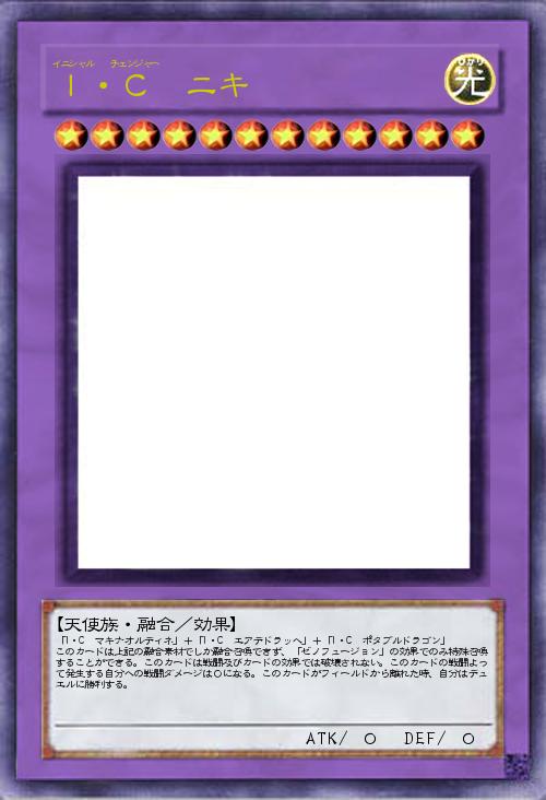 「I・C マキナオルディネ」+「I・C エアデドラッへ」+「I・C ポタブルドラゴン」 このカードは上記の融合素材でしか融合召喚できず、「ゼノフュージョン」の効果でのみ特殊召喚することができる。このカードは戦闘及びカードの効果では破壊されない。このカードの戦闘よって発生する自分への戦闘ダメージは0になる。このカードがフィールドから離れた時、自分はデュエルに勝利する。 |