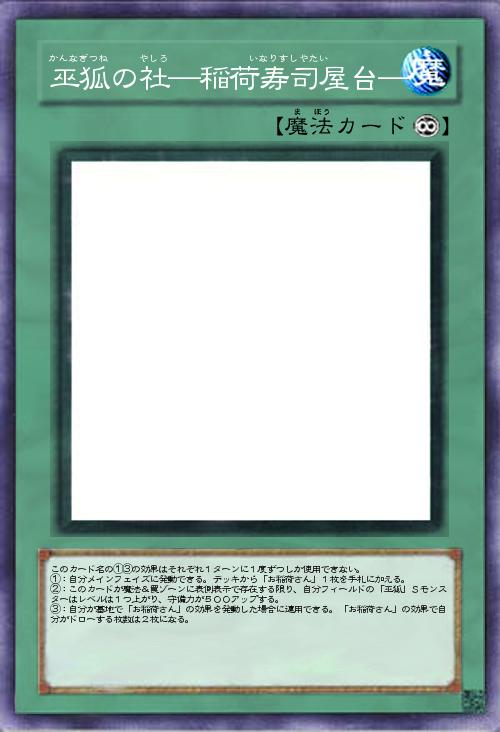 | このカード名の①③の効果はそれぞれ1ターンに1度ずつしか使用できない。 ①:自分メインフェイズに発動できる。デッキから「お稲荷さん」1枚を手札に加える。 ②:このカードが魔法&罠ゾーンに表側表示で存在する限り、自分フィールドの「巫狐」Sモンスターはレベルは1つ上がり、守備力が500アップする。 ③:自分が墓地で「お稲荷さん」の効果を発動した場合に適用できる。「お稲荷さん」の効果で自分がドローする枚数は2枚になる。 | |||