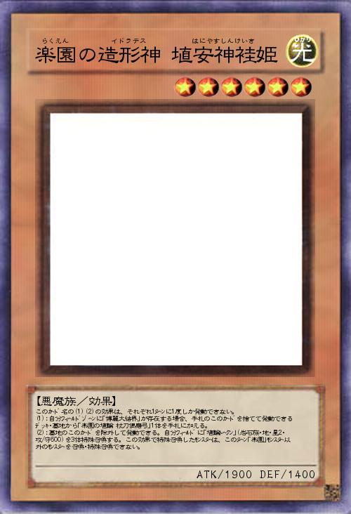 | このカード名の(1)(2)の効果は、それぞれ1ターンに1度しか発動できない。 (1):自分フィールドゾーンに「博麗大結界」が存在する場合、手札のこのカードを捨てて発動できるデッキ・墓地から「楽園の埴輪 杖刀偶磨弓」1体を手札に加える。 (2):墓地のこのカードを除外して発動できる。自分フィールドに「埴輪トークン」(岩石族・地・星2・攻/守500)を3体特殊召喚する。この効果で特殊召喚したモンスターは、このターン「楽園」モンスター以外のモンスターを召喚・特殊召喚できない。 | |||