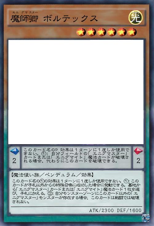 | このカード名のP効果は1ターンに1度しか使用できない。①:自分フィールドの「エニグマスター」カードまたは「エニグマイト」魔法カードが破壊される場合、代わりにこのカードを破壊できる。 | |||