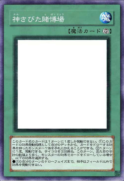 | このカード名のカードは1ターンに1度しか発動できない。①このカードの効果発動処理として自分のデッキから、カードをドローする効果を持ったモンスター1体を手札に加えることができる。②1ターンに1度、発動できる。サイコロを2回振る。このターン、出た目の合計の数値より多く、モンスターの効果でカードをドローしている場合、以下の効果を適用する。 ●次の自分のターンのドローフェイズまで、相手はフィールド以外で効果を発動できない。 | |||