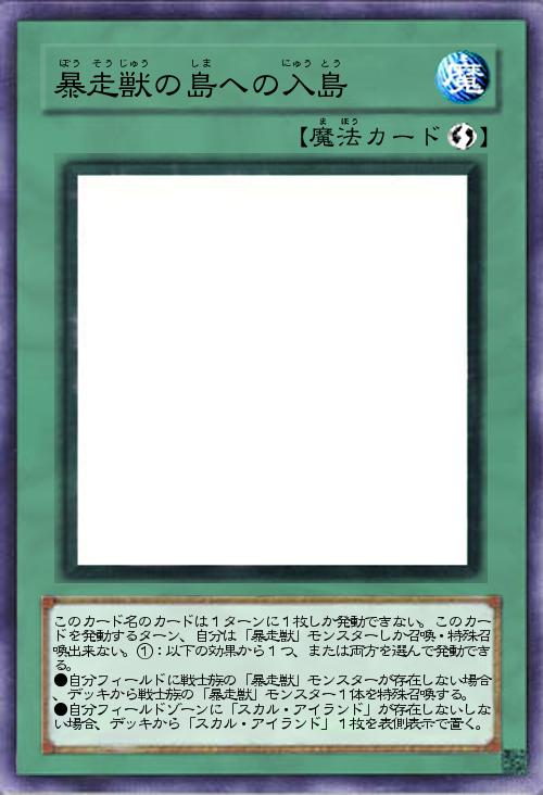| このカード名のカードは1ターンに1枚しか発動できない。このカードを発動するターン、自分は「暴走獣」モンスターしか召喚・特殊召喚出来ない。①:以下の効果から1つ、または両方を選んで発動できる。 ●自分フィールドに戦士族の「暴走獣」モンスターが存在しない場合、デッキから戦士族の「暴走獣」モンスター1体を特殊召喚する。 ●自分フィールドゾーンに「スカル・アイランド」が存在しないしない場合、デッキから「スカル・アイランド」1枚を表側表示で置く。 | |||