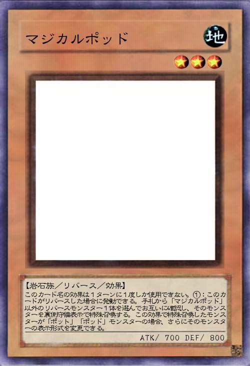 | このカード名の効果は1ターンに1度しか使用できない。①:このカードがリバースした場合に発動できる。手札から「マジカルポッド」以外のリバースモンスター1体を選んでお互いに確認し、そのモンスターを裏側守備表示で特殊召喚する。この効果で特殊召喚したモンスターが「ポット」「ポッド」モンスターの場合、さらにそのモンスターの表示形式を変更できる。 | |||