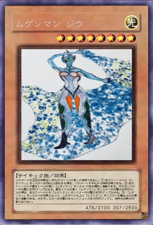 | このカードの②③の効果はいずれか1ターンに1度しか使用できない。①:自分フィールドに「ムゲンマン」モンスターが2体以上存在する場合、このカードを手札から特殊召喚できる。②:自分フィールドの最もレベルの高い「ムゲンマン」モンスター1体を選択し発動できる。そのモンスターの攻撃力を500アップさせる。最もレベルの高い「ムゲンマン」モンスターの攻撃力が3000以上の場合、自分フィールドの「ムゲンマン」モンスターの攻撃力を300アップさせる。③:「ムゲンマン」モンスターの効果によって、このカードの上に「ムゲンマン」モンスターが重ねられた場合に発動できる。そのモンスターの攻撃力をエンドフェイズまで1000アップし、相手の効果の対象にならない。 | |||