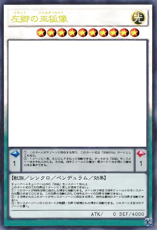 | ①:このカードがPゾーンに存在する限り、このカード名は「巫狐の社」カードとしても扱う。 ②:1ターンに1度、800LPを払って発動できる。デッキから「巫狐」モンスター1体を手札に加える。その後、相手フィールドの魔法・罠カード1枚を選んで墓地に送る事ができる。 | |||
