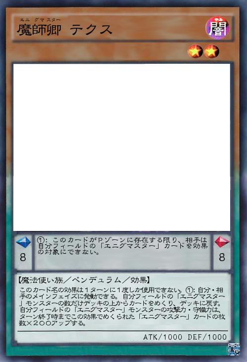 | ①:このカードがPゾーンに存在する限り、相手は自分フィールドの「エニグマスター」カードを効果の対象にできない。 | |||